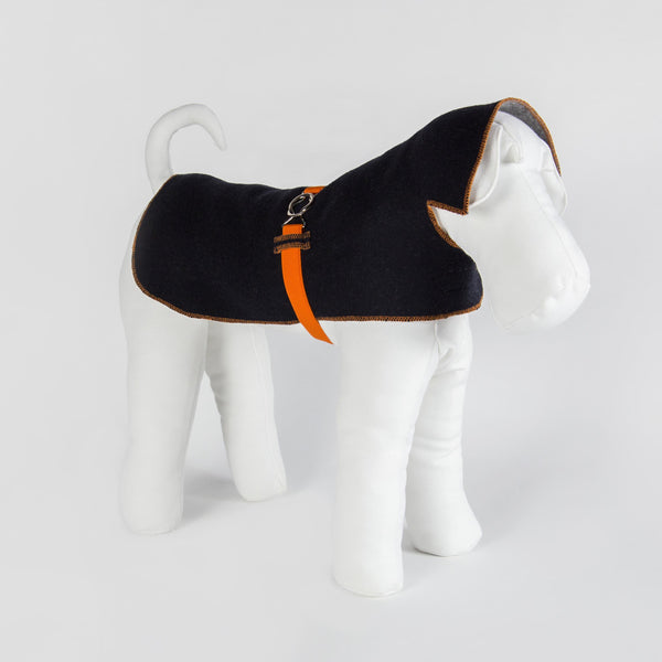 TAILORED DOUBLE-SIDED DOG COAT IN GRAY BLUE PAIRED FABRIC GRAY & NAVY-ORANGE, clothing for dogs inspired by the nautical world Reversible dog jacket made of paired sharp cut wool fabric: navy blue on one side and gray on the other....
