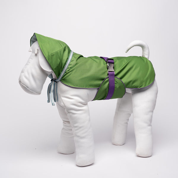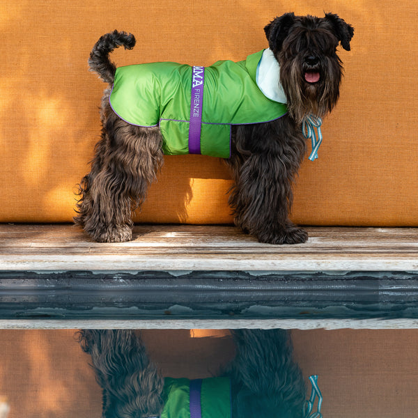 MEADOW GREEN TAILOR-MADE RAINCOAT FOR DOGS WITH PALE BLUE LINING MEADOW RAINCOAT, maximum rain protection for the trendiest raincoat This lined raincoat for dogs with hood, in grass green nylon fabric, it is totally water repellent and equipped with a...