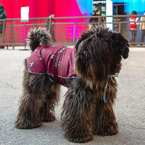 MADE-TO-MEASURE RAINCOAT, BRANDED WITH THE EMMA FIRENZE PATTERN PATTERN RAIN-COAT, techno-chic 100% waterproof raincoat for dogs Raincoat for dogs in technical fabric, wine red, totally water repellent with the ‘EMMA Firenze’ patterns in sky blue. The inner lining is made...