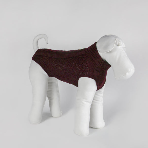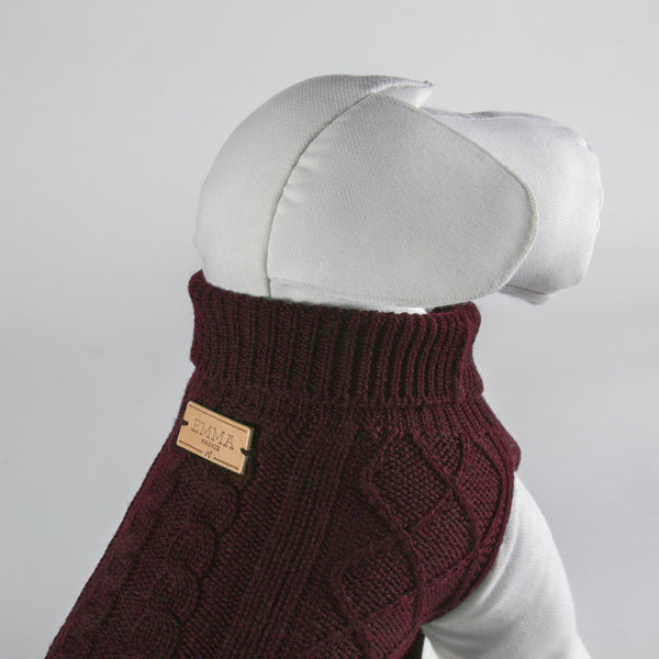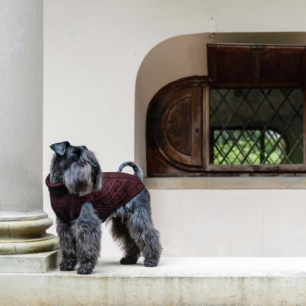 MADE-TO-MEASURE DOG SWEATER IN WINE RED PURE WOOL WINE-SKI, Anglo-Saxon style sweater for dogs Hand made wine red 6-wire pure new Merino Superwash wool knitted dog coatwith beautiful Irish ‘Aran’ motifs. A warm and light garment to protect your four-legged...